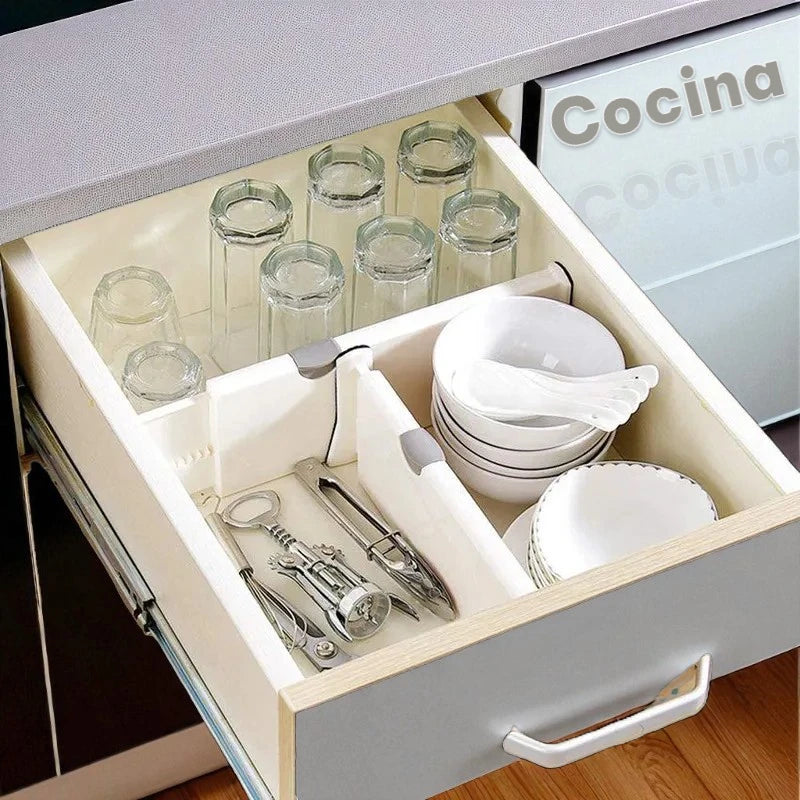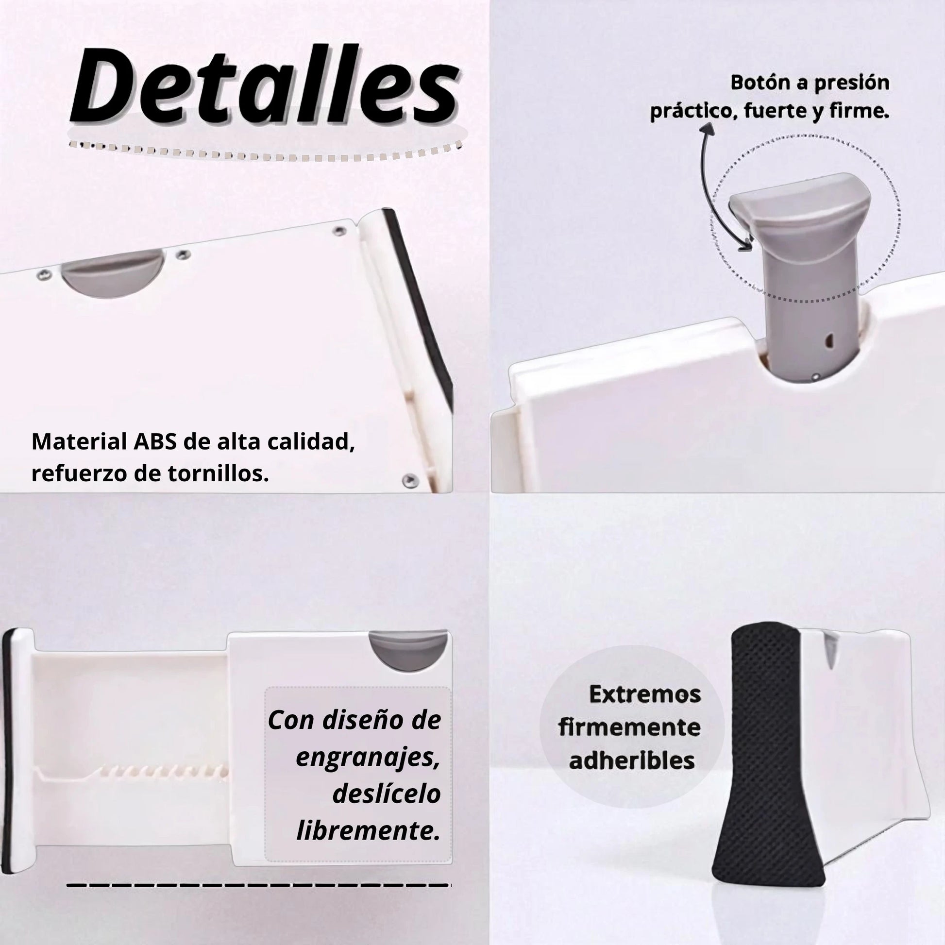 Instalación rápida, sin complicaciones Olvídate de herramientas, tornillos o pegamentos. Nuestro separador se desliza fácilmente y se instala con un solo clic. Gracias a su potente sistema de tensión, cada divisor queda firme en su lugar, sin moverse ni desajustarse. Ordenar nunca fue tan simple y rápido.